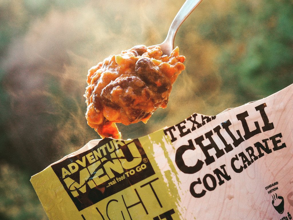 Vakuově sušené jídlo na cesty Adventure Menu Lightweight Chilli con Carne s mletým hovězím a fazolemi v husté omáčce z vývaru, cibule a rajčat. Dolijte horkou vodou, zamíchejte a vychutnejte ať jste, kde jste.
