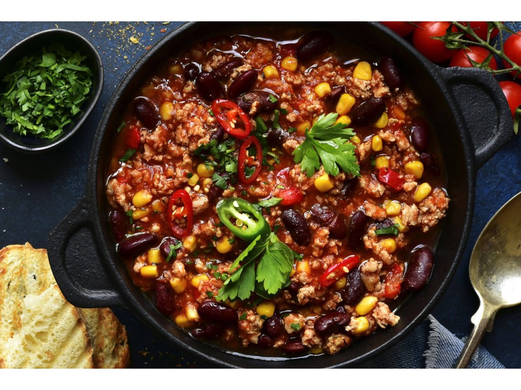 fazole sterilované (25%)(červené fazole 60 %, voda, sůl, cukr), hovězí maso mleté (20%), sekaná rajčata (15%)(rajčata, rajčatová šťáva, kyselina citrónová), hovězí vývar (15%), cibule, paprika, kukuřice sterilovaná (kukuřice, voda sůl), řepkový olej, chilli, česnek, římský kmín, sladká paprika