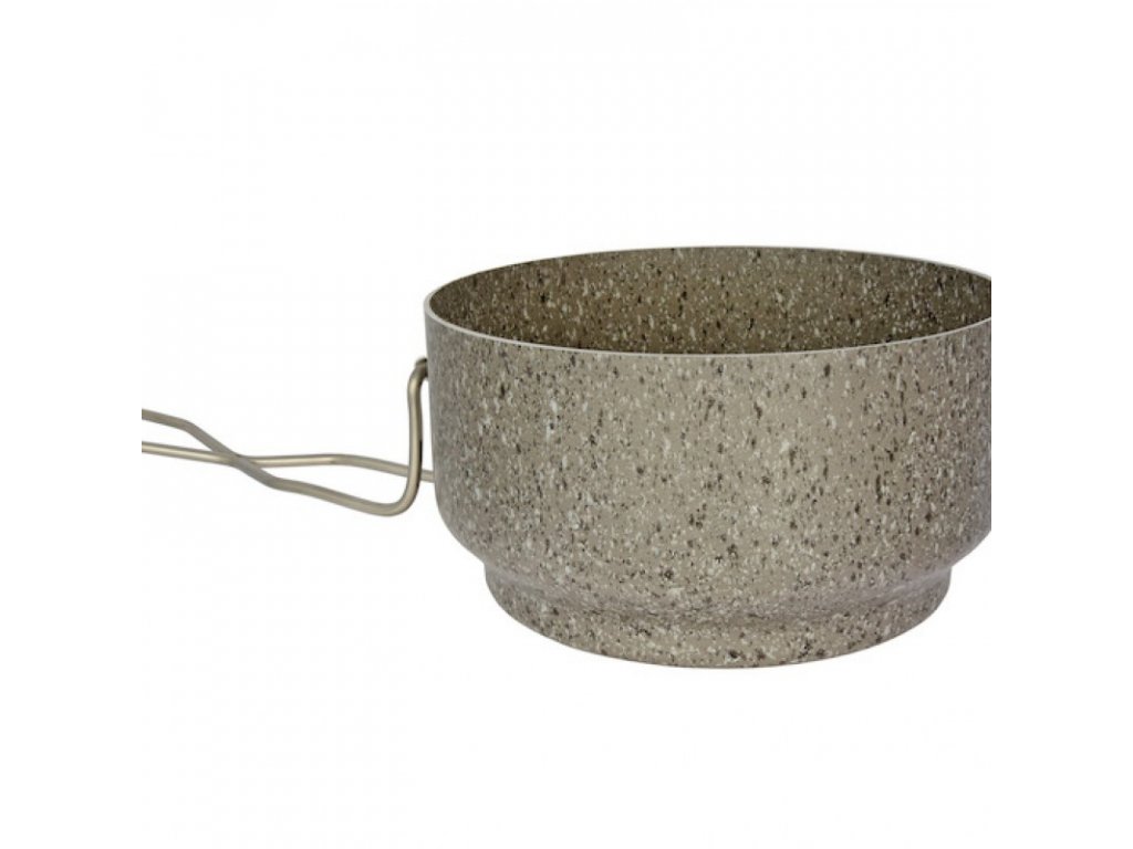 Trojdílný hliníkový ešus s unikátním nepřilnavým povrchem složený z 2 hliníkových misek o objemu 1,25 l a 0,85 l a poklice. Ešus je velice lehký, má sklopná držadla a je vyroben z kvalitního potravinářského hliníku.