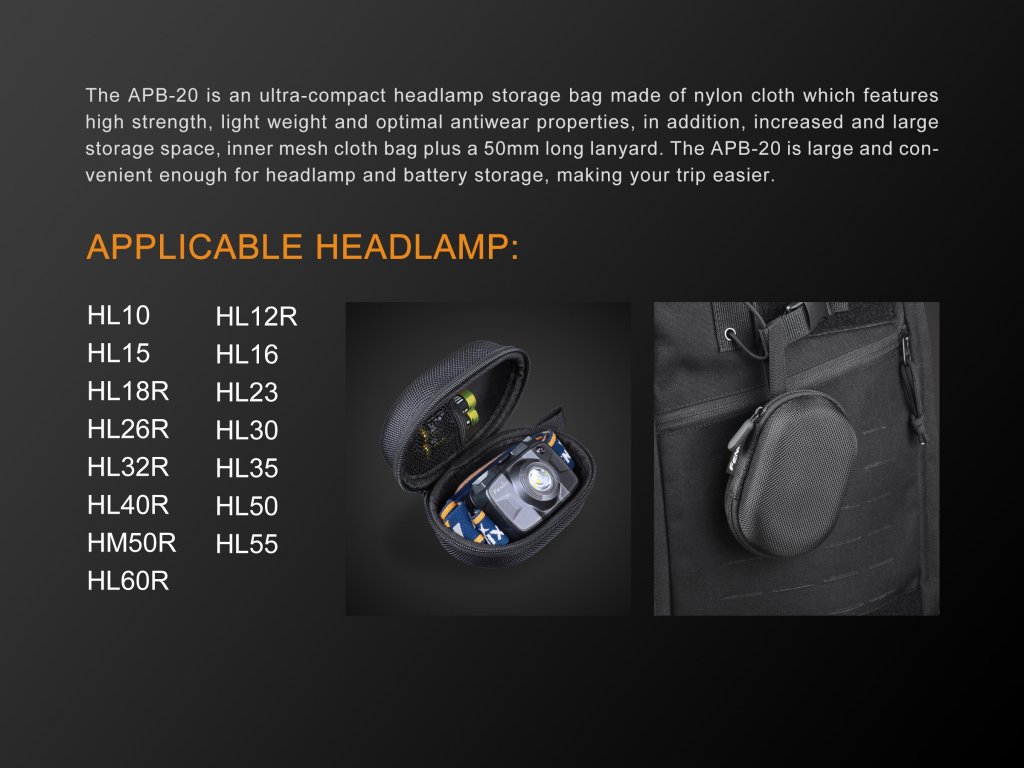 Vhodné pro většinu čelovek Fenix řady HL a HM. Čelovka HM71R a čelovky řady HP do pouzdra nepasují. U čelovek HL55, HL60R, HM60R, HM61R, HM65R, HM65R-T, HM65R-DT a HM70R je třeba pečlivě složit popruh, jinak se do pouzdra nevejdou. U HM70R zároveň není již možné využít kapsu pro náhradní akumulátor. U ostatních na e-shopu aktuálně nabízených čelovek řady HM a HL se k čelovce s popruhem vejde jeden náhradní akumulátor do velikosti 18650 nebo tři AAA baterie (pro HL16, resp. HL18R-T a HL32R-T). Pouzdro vždy zavírejte opatrně, aby nedošlo k poškození akumulátoru, nebo čelovky.