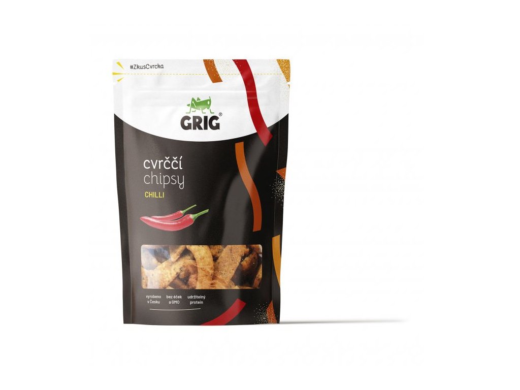 Cvrččí chili chipsy Grig jsou vyrobené z cvrččí, hrachové, čočkové a dýňové mouky a máku. Neobsahují žádná éčka ani konzervanty. Jsou však plné bílkovin, aminokyselin a vitamínů. Sušený hmyz je zdravý, přírodní a rychle obnovitelný zdroj potravy. Vemte s sebou na výlet, na dovolenou nebo vyměňte doma za brambůrky. Hmotnost 70 g.