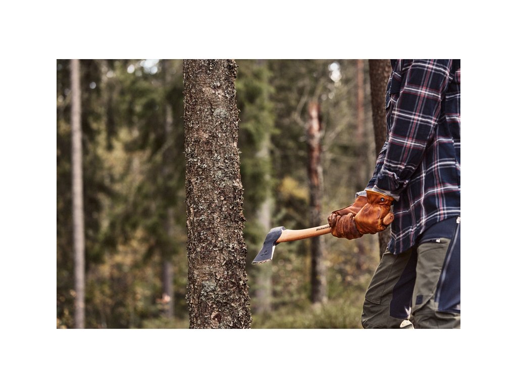Lovecká sekera Hultafors Ekelund s jemně tvarovaným krkem a středně těžkou hlavou, která je ideální pro lehčí lesnické práce a přesné stahování zvěře z kůže.