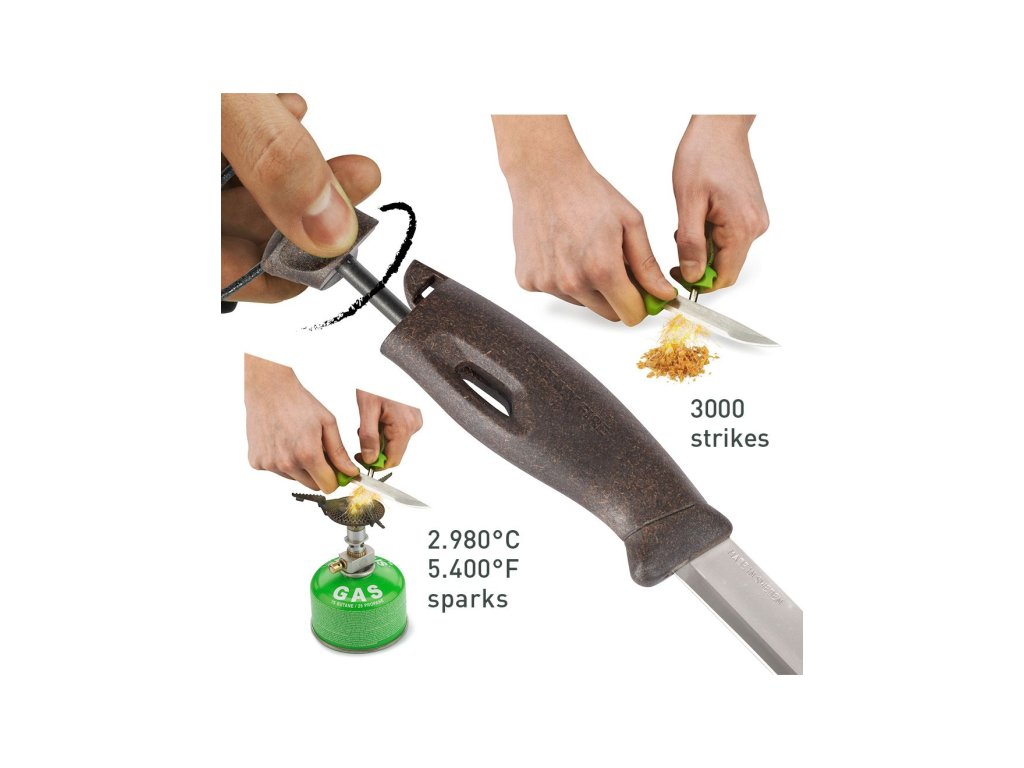 Swedish FireKnife má čepel z kalené nereznoucí oceli Sandvick 12C27 a BIOplastovou rukojeť pro kvalitní a bezpečný úchop. Profilové broušení čepeli je dostatečné k jednoduchému nařezání třísek, přičemž obrácená strana nože pracuje ideálně s křesadlem Swedish FireSteel®. Křesadlo Swedish FireSteel® bude váš dlouhodobý pomocník (až 3000 zážehů), pracuje stejně dobře i mokré a vytváří jiskry o teplotě 2980ºC.