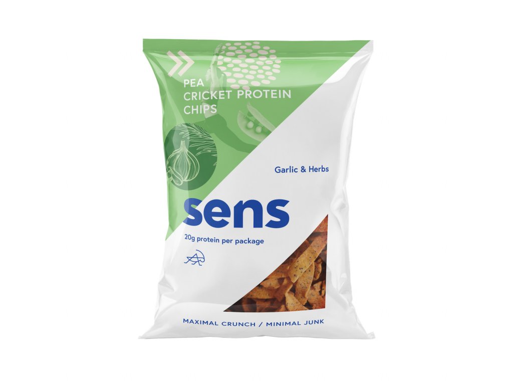 Proteinové chipsy z hrachové a cvrččí mouky a příchutí česneku s bylinkami. Balíček 80 g obsahuje 20 g bílkovin a 8 g vlákniny. Křupavé cvrččí chipsy Sens skvěle chutnají a neobsahují žádná éčka, palmový olej ani lepek.