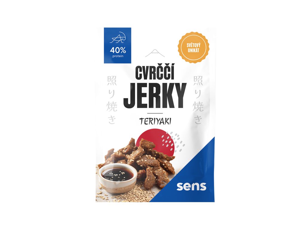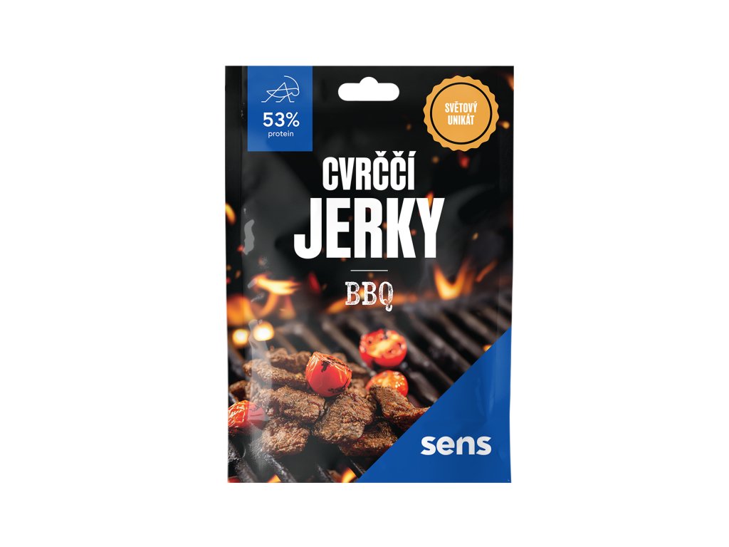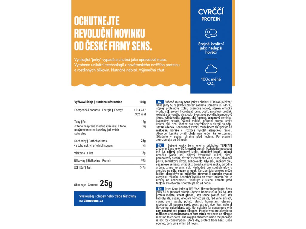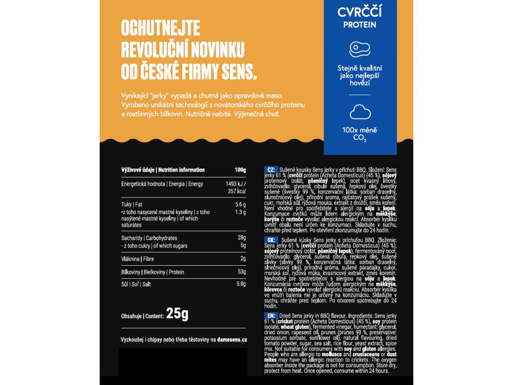 Cvrččí jerky od české firmy Sens. Světově unikátní hmyzí jerky s vysokým obsahem bílkovin výtečně chutná a dodá energii při jakékoliv aktivitě. Obsah balení 25 g.