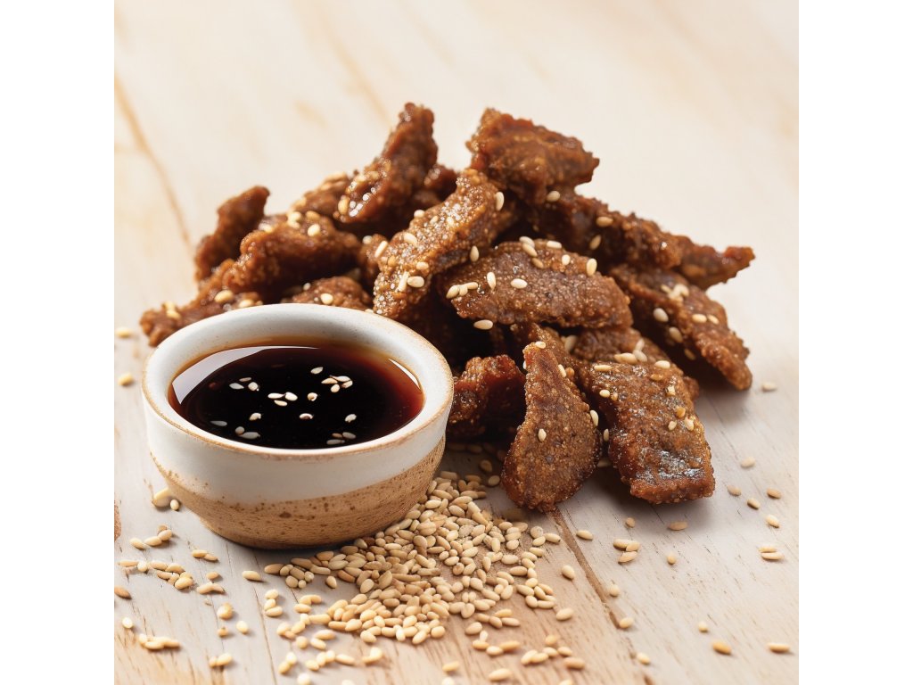 Sušené maso inspirované Japonskem! Vyzkoušejte kombinaci sladké chuti s umami sojovkou v této sladkokyselé kombinaci. Jerky je navíc posypané sezamovými semínky.